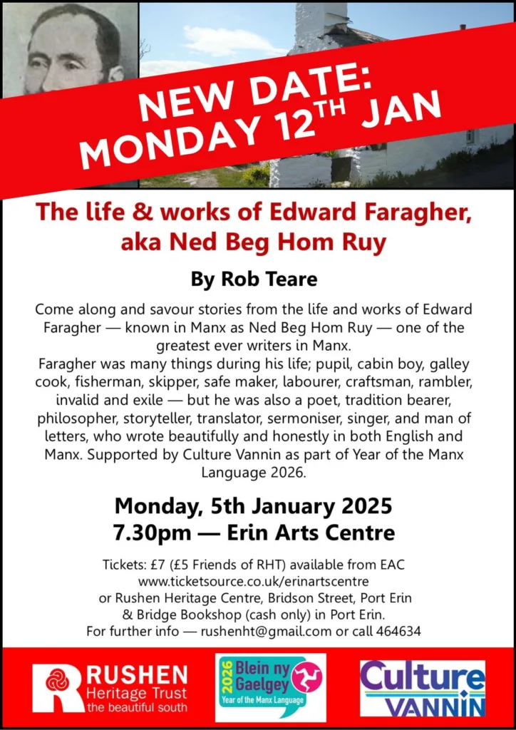 Come along for stories from the days when thousands of Manxmen sailed to the mackerel fishing in Ireland every summer, and learn about the life and times of Edward Faragher (1831-1907) — known in Manx as Ned Beg Hom Ruy — one of the greatest ever writers in Manx.