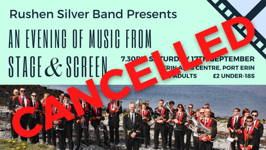 “Rushen Silver Band are immensely disappointed to announce the cancellation of our concert at the Erin Arts Centre on Saturday night. After reviewing our programme of ‘Music from Stage and Screen’, it feels to us that much of it is unsuitable for this period of national mourning. Therefore, as a mark of respect, we have chosen to cancel the event . Unfortunately, due to busy schedules, we are unable to rearrange this concert in the near future. We would like to thank the Erin Arts Centre, and all our supporters, for understanding this difficult decision. We look forward to seeing everyone at future concerts.”