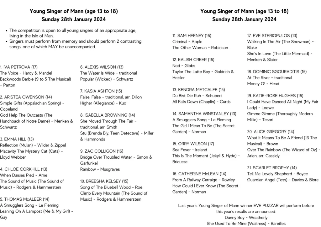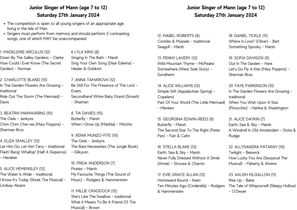 We had an incredible weekend with the Junior Singers (age 7 to 12) competing on Saturday 27th January and the Young Singers (age 13 to 18) competing on Sunday 28th January. The full programmes are included below, including the names of all songs performed.